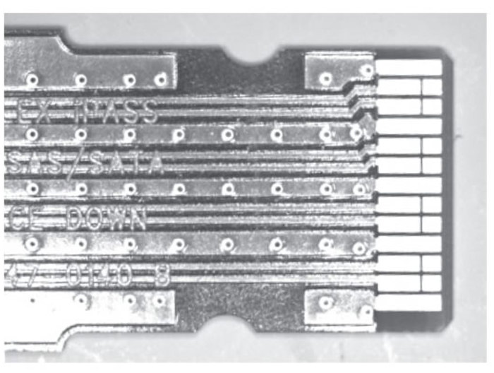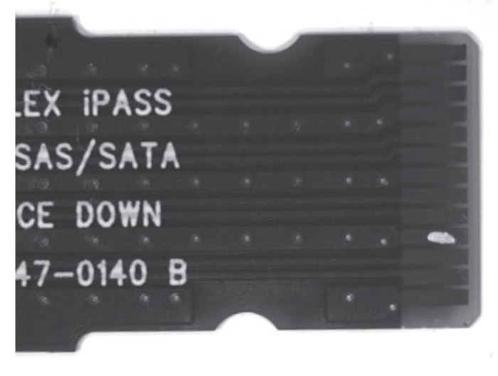 Prvý obrázok je pôvodný farebný obrázok, zatiaľ čo druhý obrázok je monochromatický príklad aplikácie. Druhý obrázok (predtým) je monochromatický obrázok aplikácie bez polarizačného filtrovania. Všimnite si, že medené vodiče na doske plošných spojov odrážajú svetlo, takže detekcia čistého toku kvapaliny je takmer nemožná. Posledný obrázok (po) ukazuje, že detekcia jasného toku je možná s polarizačným filmom MidOpt® PS007 použitým cez vysokovýkonné kruhové svetlo DCM a polarizačným filtrom MidOpt PR032 na 35 mm šošovke.